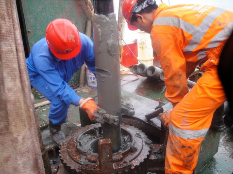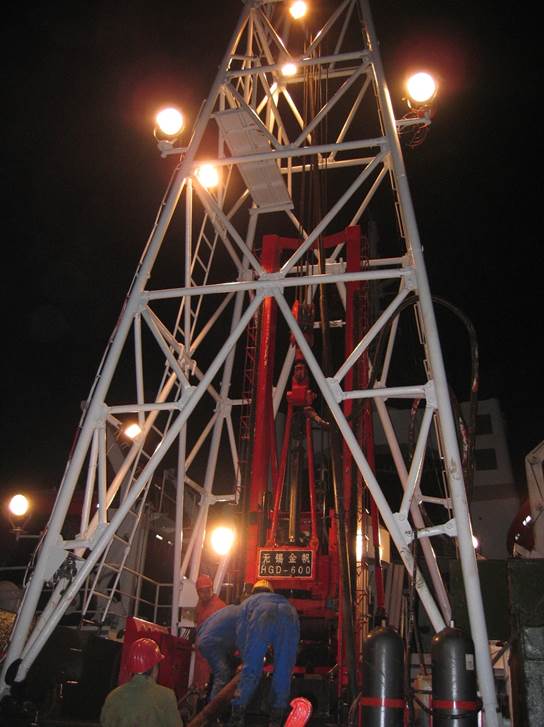 在本次钻探实施前,我所组织相关科研人员对南黄海陆架区多道地震资料进行了处理与解释,预测了钻遇层位和岩性。在此基础上又进行了单道地震外业调查工作,组织专家对获取数据进行了深入分析和反复论证,最终选取了钻孔孔位,并对地层和岩性进行了预测。而承担本次钻探任务的中石化上海海洋石油局第一海洋地质调查大队也做了精心准备,对钻机、钻头、钻探工艺和船舶的锚链等系统进行了针对性的改造,提出了多项创新性方案和技术改造,为成功实施并完成300米钻探取心任务奠定了基础。在钻孔施工过程中,项目组技术人员紧密配合,共同研究钻探施工工艺,准确把握孔内岩性层位,及时调整泥浆配比护孔,确保施工圆满完成。同时,船舶驾驶人员密切关注船舶就位情况,适时补充船锚,保证了船舶就位的稳定和钻探的正常进行。