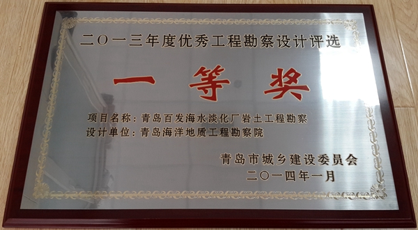 2月24日,从青岛市城乡建设委员会获悉,由青岛所海勘院完成的青岛百发海水淡化厂岩土工程勘察项目,在青岛市2013年度优秀工程勘察设计项目评选活动中获得工程勘察类(含岩土设计)一等奖。