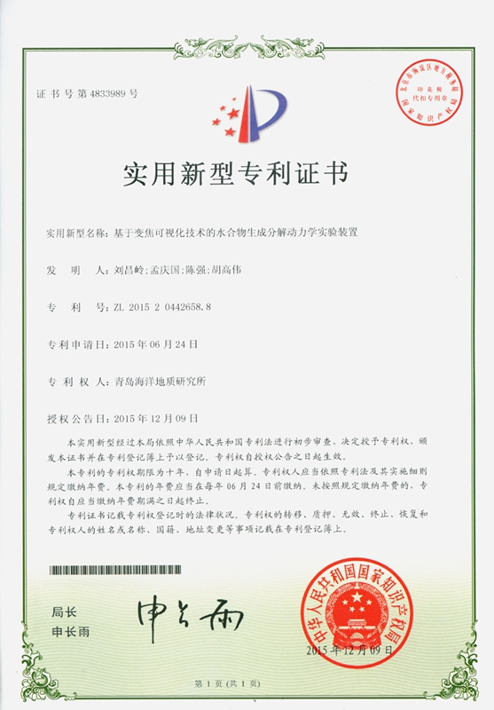 日前,国土资源部天然气水合物部重点实验室研制的“基于变焦可视化技术的水合物生成分解动力学实验装置”获得了国家实用新型专利授权,专利号:ZL 2015 2 0442658.8。