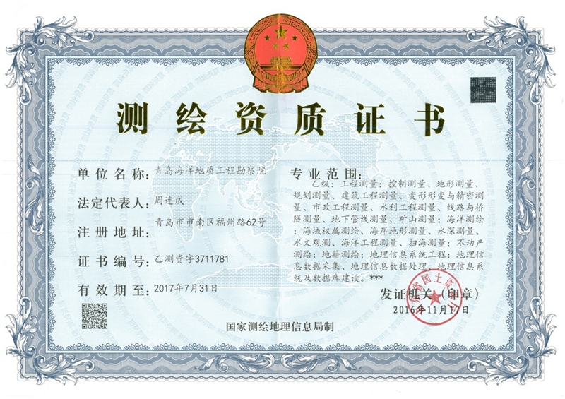 我所海勘院申报的测绘资质升级扩项申请日前已获山东省国土资源厅批准通过。 至此,海勘院测绘资质由原来的丙级,涵盖工程测量和海洋测绘2个专业6个专业子项,升级扩项为乙级涵盖工程测量、海洋测绘、不动产测绘和地理信息系统工程4个专业20个专业子项。 此次测绘资质升级扩项成功拓宽了海勘院在测绘领域的业务范围,为我所加强科研成果转化,提升科技服务能力,助力地方经济建设提供了更有力的保障。