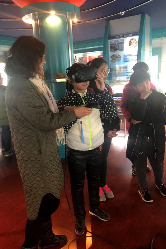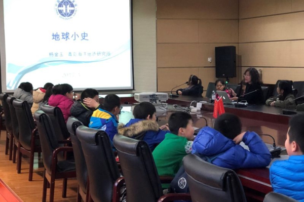 活动期间,科普工作人员首先带领同学们参观了国家国土资源科普基地海洋地质科技馆,在展览馆用通俗易懂、生动有趣地的语言介绍了地球的形成演化过程、板块运动、地震和火山、海水从哪里来等基本地学知识;然后结合青岛海洋所的业务体系介绍了新矿种天然气水合物及传统能源矿产石油天然气、砂矿等海洋地质矿产方面的科普知识。科技馆新增加的海洋地质虚拟现实科普系统(VR)引起了同学们浓厚的兴趣,大家纷纷排队试戴观看,身临其境地感受了什么是海底冷泉、海底热泉,对看到的汩汩冒烟的黑、白、黄烟囱及烟囱周边的小动物群发出了啧啧的称奇声。