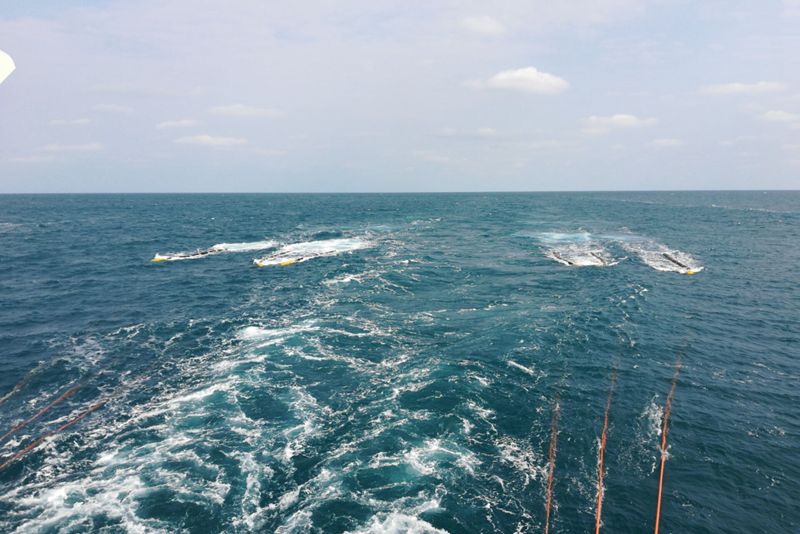 试航期间,“海洋地质九号”先后完成了扩展器收放试验、6排枪阵收放试验、电缆和水鸟尾标等设备的收放试验。并使用384道共计4800米采集电缆,总容量8730立方英寸GII气枪枪阵的双震源,采集完成了三条总长度超过60千米的试验测线。试航期间,测试了二维和三维两种采集模式,还对所有多道地震调查系统的备用设备进行了试验。