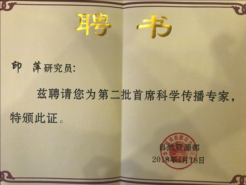 4月22日,自然资源部在北京举行首席科学传播专家聘任仪式,中国地质调查局青岛海洋地质研究所印萍研究员被聘任为自然资源部第二批首席科学传播专家。