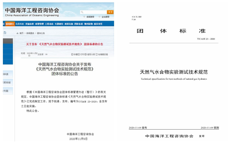 近日,中国海洋工程协会发布公告(中海协发〔2020〕7号),由自然资源部中国地质调查局青岛海洋地质研究所研制的团体标准《天然气水合物实验测试技术规范》正式获批发布、实施,标准编号T/CAOE 23-2020。该标准是青岛海洋所科研人员2018年承担的海洋工程标准化建设课题(CCSOA-OEAS-2018-02)的成果,编写组在多年来天然气水合物实验测试工作的基础上,根据标准编制要求,广泛征求各方意见,反复修改完善了标准文稿,于2020年11月9日获批发布。