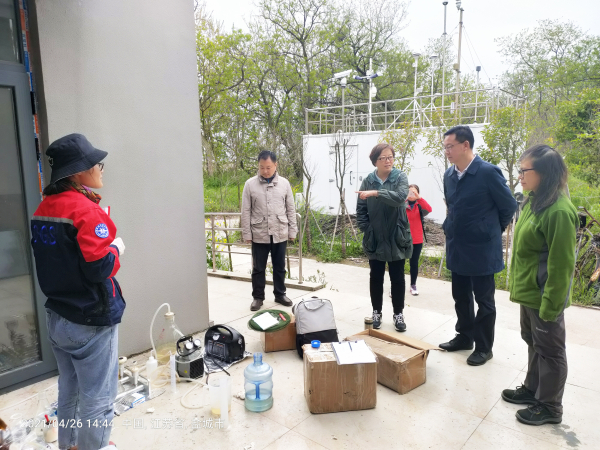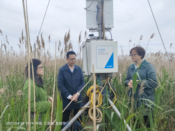 工作组一行下火车后直抵外业组工作地--新洋港保护区。拨开高耸茂密的芦苇丛,踩着狭长曲折的木栈道,工作组一行在外业人员的引领下步行来到外业观测现场,详细询问外业组当前工作进度,实地查看增温观测站、涡度观测塔运行管理情况及基地实验楼学术报告厅装修工程进展,了解掌握外业组食宿行保障、野外经费支出、安全工作落实等情况,并听取了外业组简要汇报。