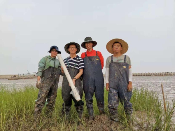 广袤的盐碱地和芦苇丛,烈日直晒无树木遮阴,牛虻和蚊子横飞无孔不入。检查组随外业工作组人员一起穿上橡胶皮裤,手持铁锨等取样工具,深一脚浅一脚跨越泥泞的潮滩深入滩涂深处的互花米草丛中进行了柱状样取样,在历经取样器压入、沉积物提取和记录、取样点位保存等一系列科学规范操作后,成功获取了柱状样品;随外业工作组一起深入芦苇丛中,现场采集了表层土壤样品和植物样品,查看了水文井建设现场及水样采集过程。