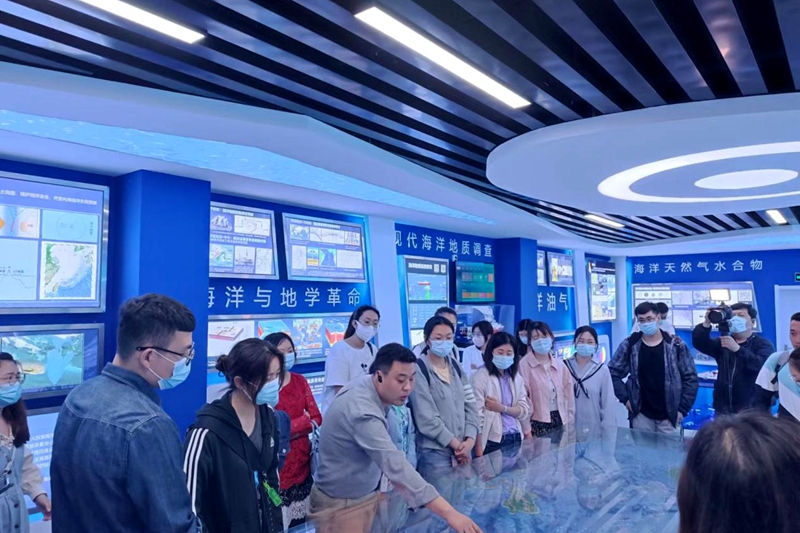 随后,科技人员带领老师们在海洋地质科技馆进行了实地场景培训,齐君高级工程师进行了全程讲解。首先在“认识地球厅”,从宇宙大爆炸开始,介绍了宇宙、太阳系以及地球的演化过程,了解了地球的前世今生,讲述了人类探索太空的历史进程和为取得的重大科学进展。在“生命演化厅”,以地质时代为脉络,介绍了地球生命的诞生以及五次生物大灭绝事件,警醒大家爱护地球珍爱海洋。在“矿物岩石厅”,介绍了三大岩石的分类及成因,观察了不同类别的岩石标本。在“海洋地质厅”,更进一步的介绍了海洋生物、海洋探测、海洋资源、海洋环境等知识,围绕中国海的沙盘介绍了海底地形地貌和海洋权益。老师们边走、边看、边听,对参观的每个细节都表现出浓厚的学习和探究兴趣。活动结束后,老师们纷纷表示,这样的培训方式鲜活生动,培训内容新颖有趣,切实达到了提高海洋素养的目的。