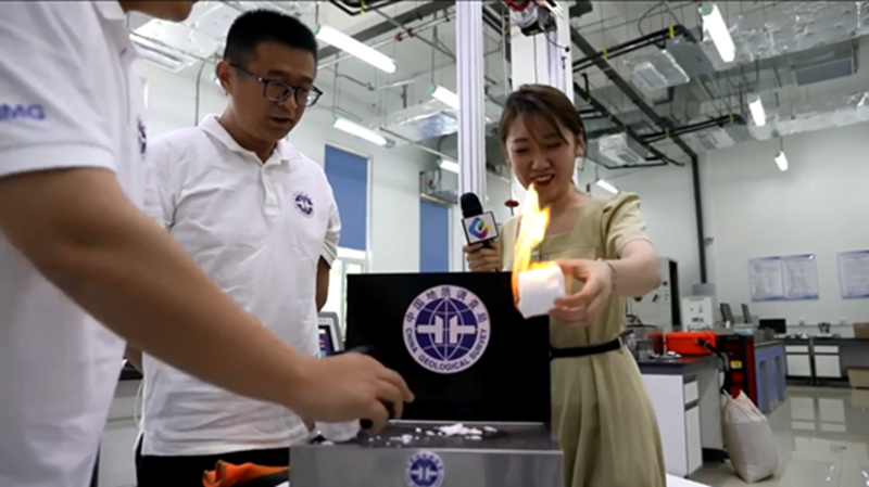 探秘之旅从青岛所“海洋地学之光”雕塑处开启,胡高伟研究员首先介绍了自然资源部天然气水合物重点实验室的建立、研究方向、工作内容、工作人员以及各个子实验室情况,让大家对接下来的探秘之旅充满期待。跟随镜头,大家在样品制备间看到了人工合成的可燃冰样品,见识了“可燃冰”的真面目。在大家还在质疑这种冰是否真的可以燃烧的时候,科研人员现场点燃了主持人手中的可燃冰样品,洁白的冰上燃烧起熊熊火焰,让人叹为观止!也让观众对这种能源界的新秀产生了更大好奇。