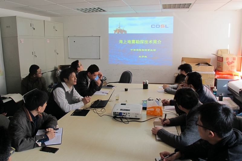 讲座期间,与会人员首先通过一段动画放映形象的认识了目前海上大型物探船配备的地震勘探专业设备。随后听取了王子秋利用拆分方式对海上地震采集系统、综合导航系统、水下控制系统和震源系统的组成的讲解,以及目前中海油服的主流物探设备的介绍。此外,还了解了近年海上地震勘探技术取得的重大进展。