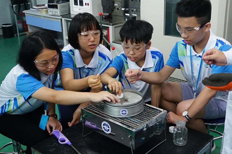 在可燃冰微观结构拼接比赛、可燃冰实物“望闻问切”和可燃冰成藏过程成像演示等环节,夏令营学员在科学导师的指导下,从多尺度、多角度认识可燃冰,动手合成并点燃可燃冰样品,亲手触摸实际深海可燃冰实物样品,观看可燃冰烧水视频,使学员通过亲身感知加深认识,培养学生树立正确的科学观,使他们走近科研、认识科研、爱上科研。