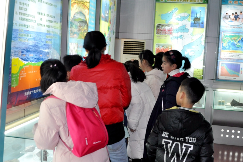 期间,科普志愿者带领小学生和初中生们参观了海洋地质科技馆,讲解了有关地球的历史、板块运动、海洋形成等基本的地质学知识和矿产资源等。