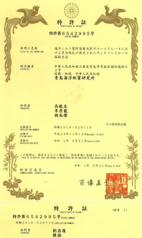 日前,自然资源部中国地质调查局青岛海洋地质研究所在天然气水合物高效开采研究领域取得创新成果,新获一项国际发明专利(专利号:“特许第6542995号”),研究成果获得国际认可。