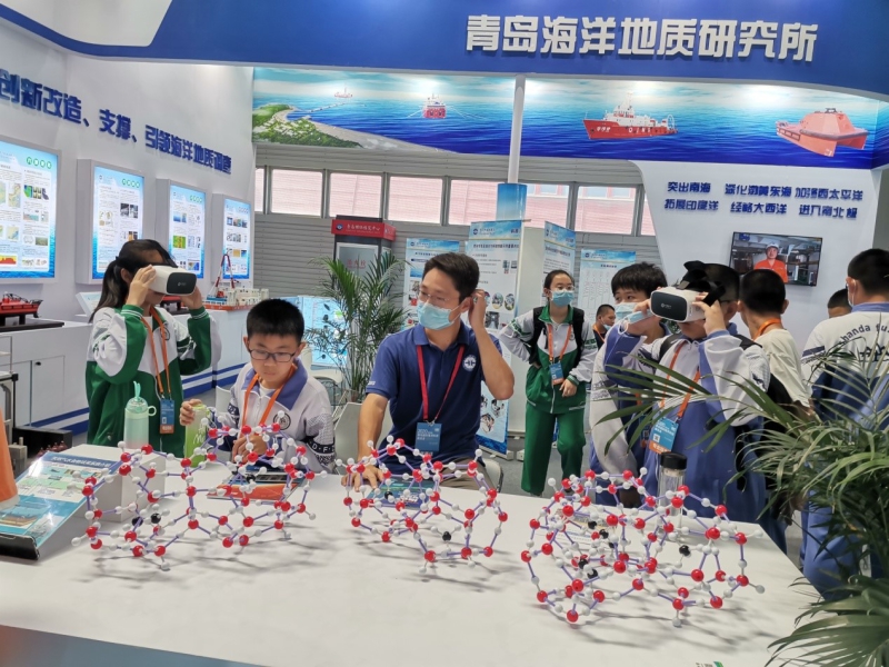 在为期三天的展会上,青岛海洋地质研究所通过展板、实物、模型、视频和现场讲解等形式,展示了海洋基础地质、海岸带综合地质、海洋油气地质、天然气水合物地质、深海地质与矿产、数字海洋地质等六大业务领域和海洋探测、数据处理、实验测试、海洋信息核心技术的创新性成果。今年更是首次展出了自主研发的3000米级海底沉积物原位多参数探针及布放系统模型、深海缆控可移动平台模型、深远海地磁日变观测系统模型、多用途水面自主测量平台模型,并演示了海洋地质虚拟现实科普VR系统,现场讲解拼接了可燃冰分子模型,详细介绍了海洋地质系列研学课程等科普产品。