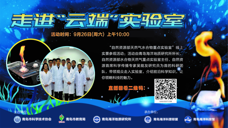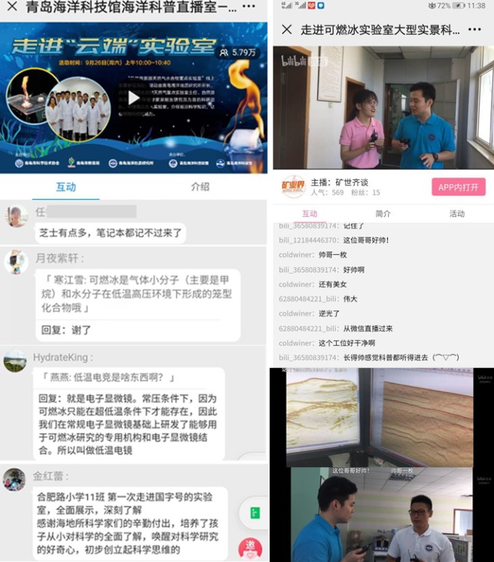 2020年9月19日,以“决胜全面小康、践行科技为民”为主题的全国科普日活动在全国范围内同步启动。9月26日,自然资源部中国地质调查局青岛海洋地质研究所与青岛市科学技术协会、青岛市教育局、青岛水族馆联合举办了一场“走进可燃冰实验室”大型实景科普直播活动,活动通过青岛海洋科普联盟科普直播室、中国矿业报社Bilibili平台“矿世奇谈”直播间面向全网直播。