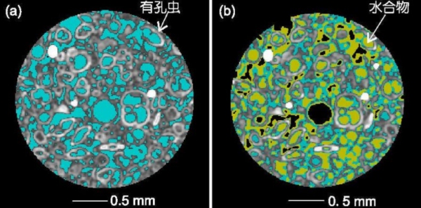 纯有孔虫壳体介质中甲烷水合物生成前(a)和生成后(b)的微观分布图