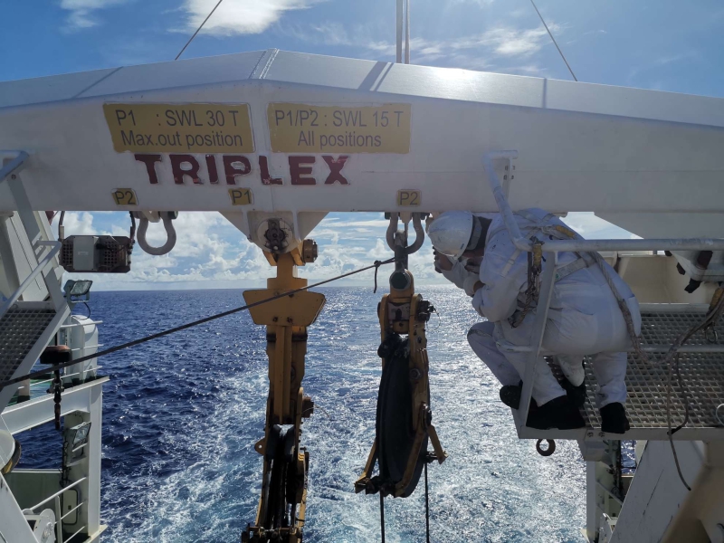 但时间不等人,调查船仍托着6000米设备低速航行。据地形资料显示,测线前方有一大型海山,设备如果不迅速回收,近2000米的落差无疑使船只面临着撞山的危险。团队随即作出决定,采用人工排缆的方式,迅速回收设备,再进行绞车维修。