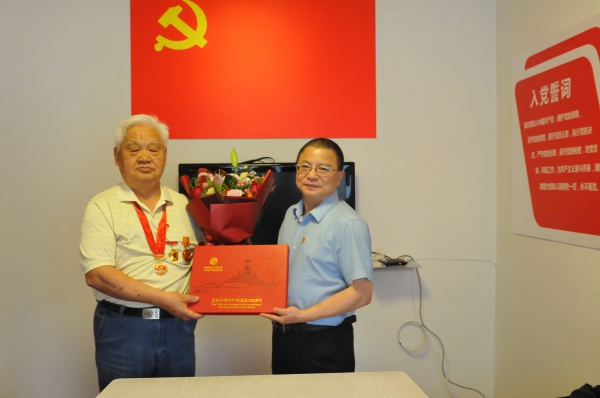 纪委书记戴明元为老党员孙德庆颁发纪念章
