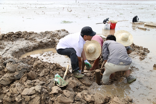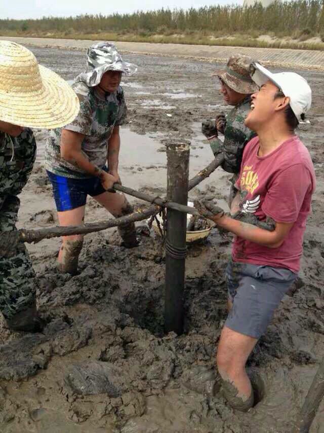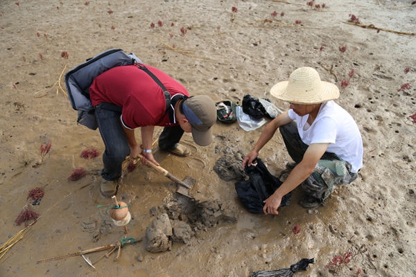 据项目负责人高茂生博士介绍,本次调查历时18天,于国庆前夕圆满完成第一阶段的潮间带采样工作,共在青岛大沽河口、营口、塘沽、黄河三角洲、秦皇岛、烟台等地完成了10个站位沉积柱样的采集、20条剖面表层沉积物的采集、15条剖面的生物样品的采集。调查发现,调查点多属泥质潮滩,底质松软易下陷,工作人员开展柱状采样需行至中潮滩,多人合作才能从泥滩中取出长度大于1米的样品;而表层样和生物样则需徒步深入潮下带,潮中带以及潮上带取样。此外,调查小组集思广益,在实验中不断摸索,循序渐进,总结经验,逐步建立了适合潮间带柱状样采集的方法。