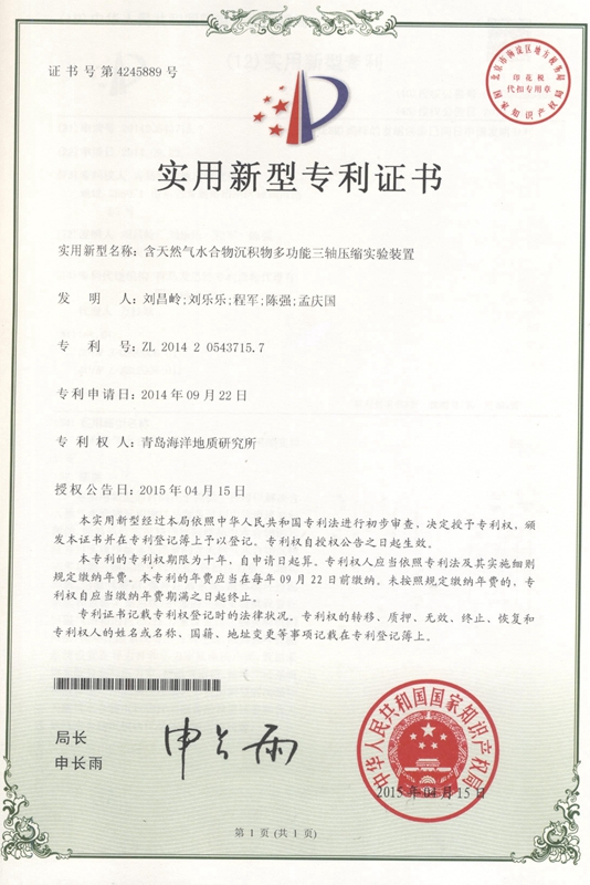 日前,我所研制的“含天然气水合物沉积物多功能三周压缩实验装置”获国家实用新型专利。