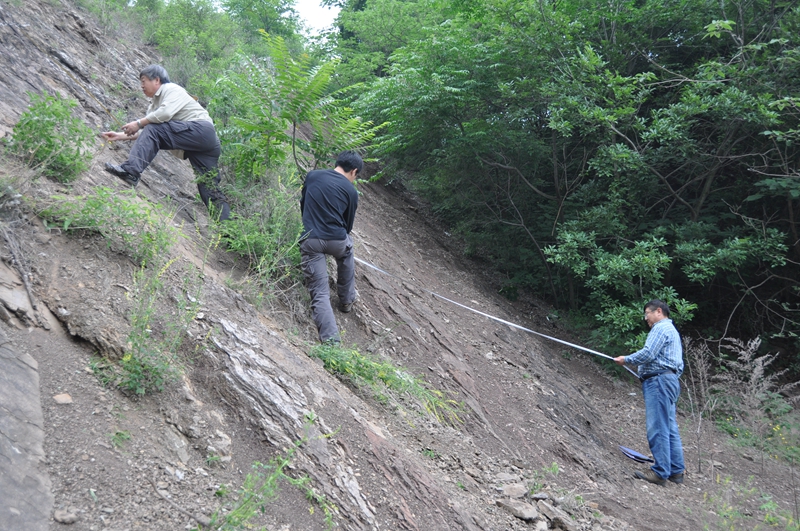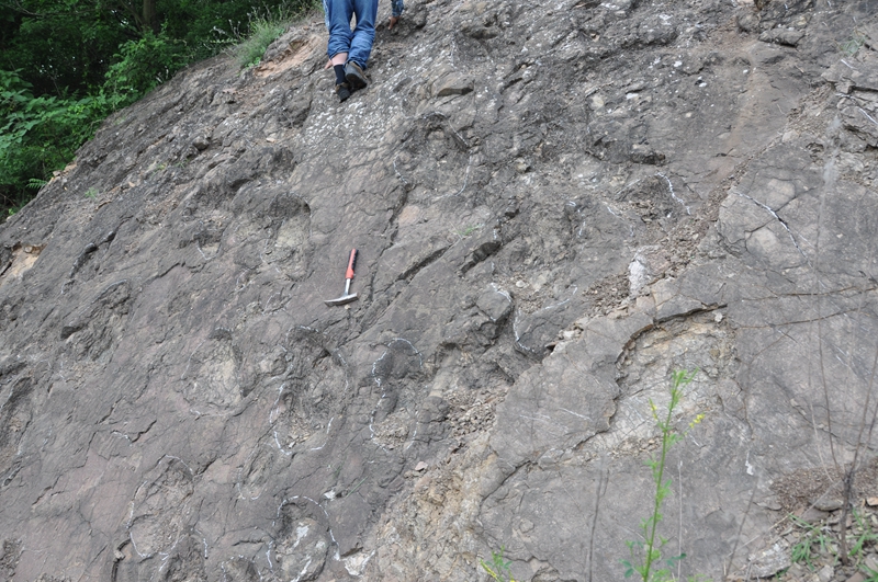 据“山东晚中生代恐龙足印化石调查研究”专题负责人李日辉研究员介绍,2015年5月下旬专题组成员会同北京自然博物馆专家在山东省南部郯城、临沭、莒南等地开展了为期5天的恐龙足迹化石的野外调查。期间,在郯城县清泉寺附近发现一个大型恐龙足迹化石点,该化石点出露在一个陡倾的坡面上,地层倾角60度,面积约100平方米,根据区域地质资料,化石产出层位为下白垩统大盛群孟疃组。调查发现该化石点恐龙足迹较凌乱,方向性较差,据不完全统计,共有足迹90多个,多为椭圆形、圆形,最大的65×33厘米,最小的13×13厘米。初步研究表明,这些足迹主要由蜥脚类恐龙形成,造迹者多为成年个体,也有少量幼年个体。同时,还发现少量大型三趾型足迹,造迹者可能是兽脚类恐龙。此外,该化石点的化石面貌与邻区著名的莒南县后左山化石点有很大差别,后者主要以兽脚类恐龙足迹为主。