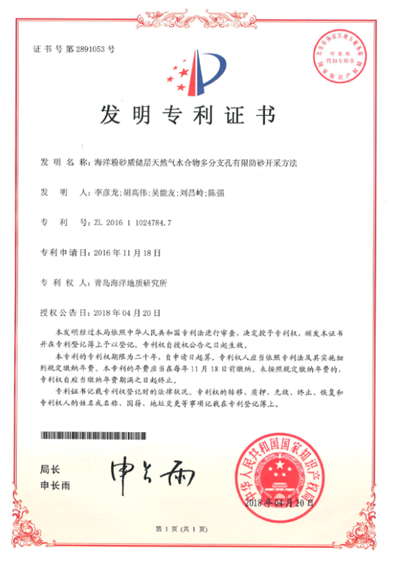 日前,中国地质调查局青岛海洋地质研究所自主研发的“海洋粉砂质储层天然气水合物多分支孔有限防砂开采方法”获得了国家发明专利授权,专利号为ZL 2016 1 1024784.7。