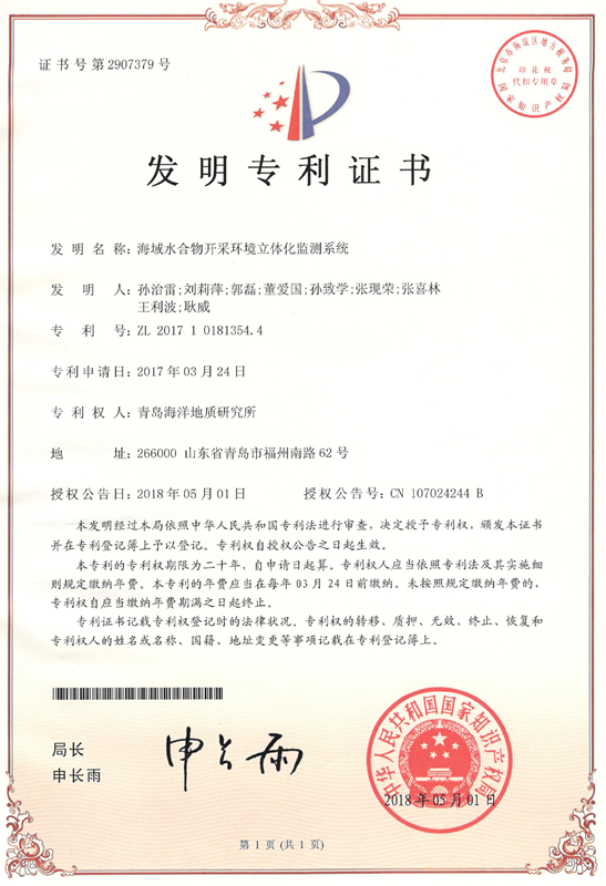 日前,我所天然气水合物地质室自主创新的“海域水合物开采环境立体化监测系统”获得了国家发明专利授权,专利号:ZL201710181354.4。本发明涉及水合物开采过程中的海洋环境监测、评估和预测。