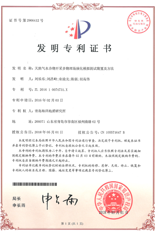 日前,自然资源部中国地质调查局青岛海洋地质研究所自主研发的“天然气水合物开采多物理场演化模拟测试装置及方法”获得了国家发明专利(ZL 2016 1 0074731.X)授权。