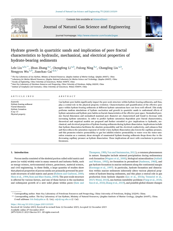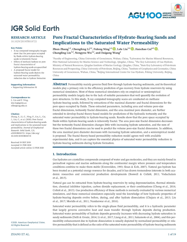 据悉,近两年来该团队在天然气水合物储层基础物性评价与预测等方面持续攻关,前期研究成果已经在《Journal of Geophysical Research: Solid Earth》、《Journal of Natural Gas Science and Engineering》和《中国科学:物理学力学天文学》等国内外科技期刊发表。这些成果标志着含水合物沉积物孔隙尺度结构定量表征技术的初步形成和含水合物沉积物有效孔隙分形理论的初步建立,可为海洋天然气水合物资源勘探与开发提供有益参考。