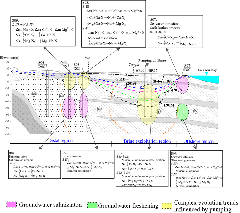 研究表明过度开采前后卤水地下水位和浓度变化显著。通过稳定同位素(δ18O和δ2H)特征发现浅层地下咸水对地下卤水具有补给作用。在近海卤水/咸水界面处的浅层地下咸水和深层地下咸水均受海水入侵影响。其中,浅层地下咸水经历咸化过程(Na+交换为粘土中的Ca2+和Mg2+),深层地下水经历了一个淡化过程。在咸/淡水界面处的浅层地下咸水受淡水开采的影响呈现复杂的演变过程,而深层地下水受卤水侵入影响呈现咸化过程。水化学模拟结果表明,在限制开采阶段,由于石膏和岩盐的溶解,卤水浓度得到了恢复,但是恢复程度有限。