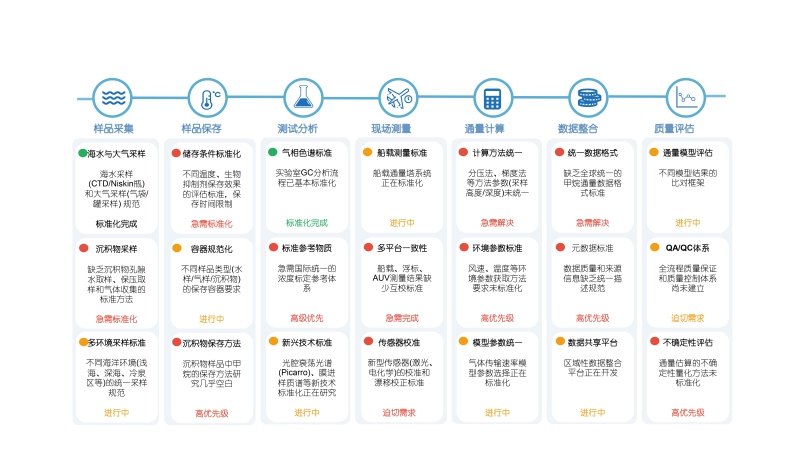 据介绍,海洋甲烷作为增温潜势达二氧化碳近30倍的强效温室气体,其源汇过程深刻影响全球气候变化。然而,由于海洋环境的时空异质性、甲烷浓度梯度跨越多个数量级,以及监测技术的碎片化,全球海洋甲烷数据的可比性长期面临严峻挑战。研究指出,当前近岸海域甲烷监测在多个环节存在标准化缺失。在样品采集方面,海水、沉积物和大气采样缺乏统一规范,低浓度样品保存与处理流程不一致;在分析测试环节,低浓度甲烷精准测量困难,同位素标准物质严重缺失,不同技术间系统偏差显著;在通量测量中,不同方法(如涡度协方差法、箱式法、梯度法)结果差异可达数量级,生物扰动与气泡传输等关键过程缺乏标准化校正模型。