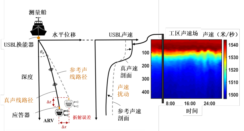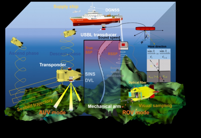 随着新型深海自主/遥控混合式水下机器人在深海矿区的推广应用,其搭载的超短基线声学定位系统(USBL)与捷联惯性导航系统(SINS)组合导航技术成为提升设备水下安全和作业效率的关键。团队科研人员针对SINS和USBL组合导航,基于分层等梯度射线声学跟踪原理推导分析了USBL的位置解算与声速剖面的数学模型,将USBL的原始声学观测量同SINS进行紧组合。