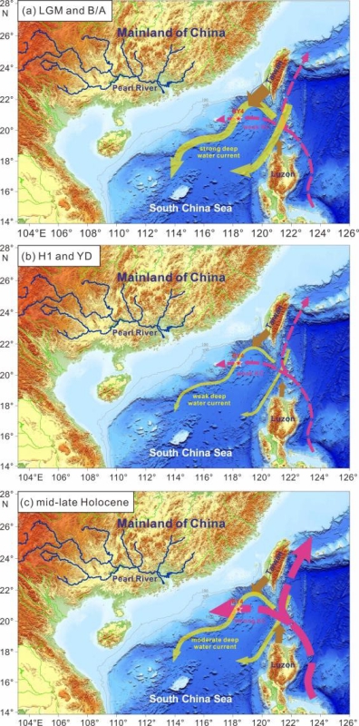 研究发现,南海北部沉积物物源贡献变化与南海海洋动力过程的千年尺度波动密切相关。末次冰盛期(LGM)台湾西部沉积物的输送受控于深层流强盛;中全新世以来吕宋岛来源沉积物贡献相对增加,与黑潮入侵大幅增强有关。末次冰消期H1和YD事件时期,台湾来源沉积物比例骤降,指示南海深层流强度显著减弱。南海深层流减弱与北太平洋中层水(NPIW)的强化呈反相位关系,揭示了北太平洋中层水变化对南海深层流和沉积物输送的重要调控作用。该研究从沉积物源–汇过程角度,系统阐释了南海北部深层流与黑潮在晚第四纪沉积物输运中的协同控制机制,为深入理解边缘海沉积系统对海洋环流变化的响应提供了重要依据。