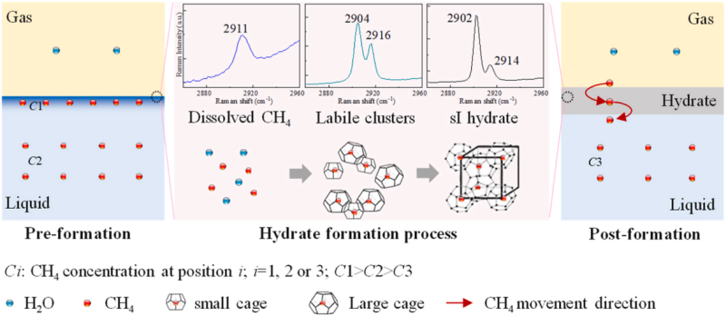 近日,中国地质调查局青岛海洋地质研究所在界面体系水合物相变机理研究方面取得新进展,相关研究成果以《Evolution characteristics of methane concentration and microscopic formation mechanisms of methane hydrate: Insights from in-situ Raman spectroscopy》为题,发表于国际能源领域权威期刊《Gas Science and Engineering》。