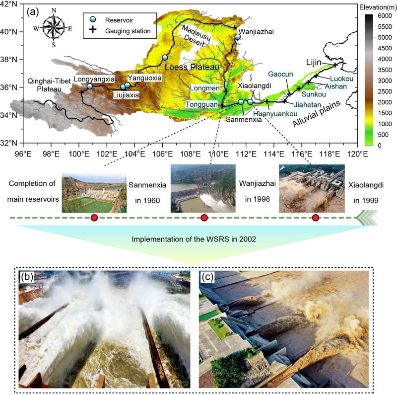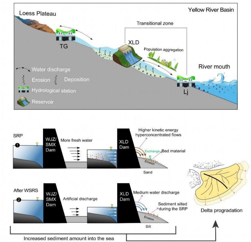 河口三角洲是全球社会经济活动和生态多样性的重要地区之一。受海平面上升,地面沉降,泥沙通量降低的影响,全球许多三角洲发育受到了重大威胁。黄河调水调沙工程(WSRS)为全球河流管理提供了宝贵见解,其通过释放水库淤积泥沙和冲刷下游河道来增加入海泥沙量(尤其是粗颗粒组分),因而增强了河口三角洲的稳定性。然而,WSRS的持续性效用仍有待评估。此外,如何更加高效地利用WSRS来维持黄河三角洲的发育也是亟待解决的关键问题。研究人员利用近二十余年黄河流域内多元数据集(河流水沙-水库-下游河道-河口三角洲)对WSRS进行了综合评估,并结合COWAST理想数值模型探讨了一种可能优化WSRS的水沙调节方案。