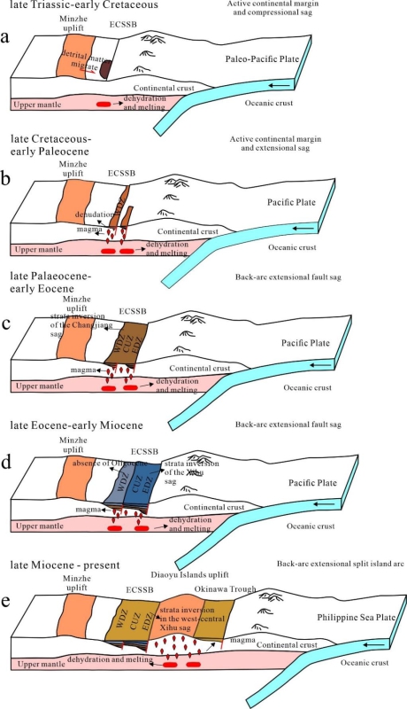 弧后沉积盆地是研究大洋与大陆地球动力过程与机制的关键。东海陆架盆地属于西太平洋洋-陆过渡带的弧后沉积盆地,其各凹陷的构造变形特征及演化特征存在显著差异,导致盆地演化的深部动力学机制认识不一。研究团队基于东海陆架盆地二维多道地震资料精细解释,开展了盆地构造变形解析,恢复了盆地构造演化过程,并结合板块汇聚过程与深部壳幔作用探讨了东海陆架盆地构造变形的控制因素与深部动力学机制。