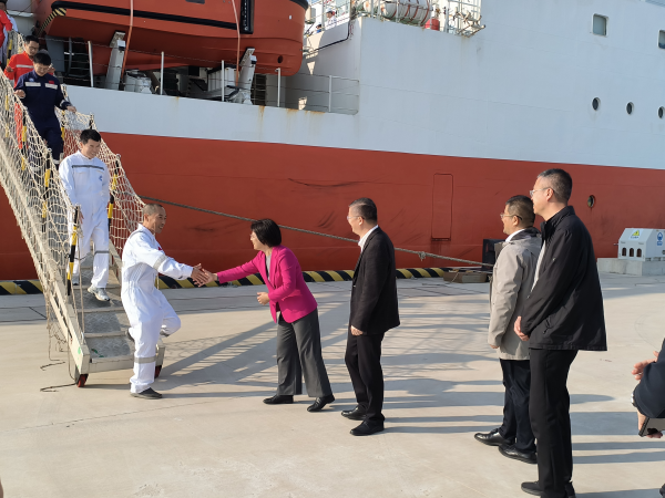 2025年11月4日下午,中国地质调查局青岛海洋地质研究所“海洋地质九号”船缓缓驶入“梦想”号北部码头,标志着该所2025年度海上计划调查任务圆满完成。青岛海洋地质研究所副所长印萍率队前往码头迎接,向凯旋的全体科考队员致以诚挚慰问。