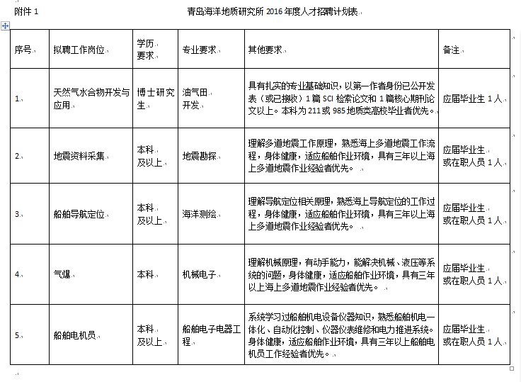 附件:1.青岛海洋地质研究所2016年度人才招聘计划表