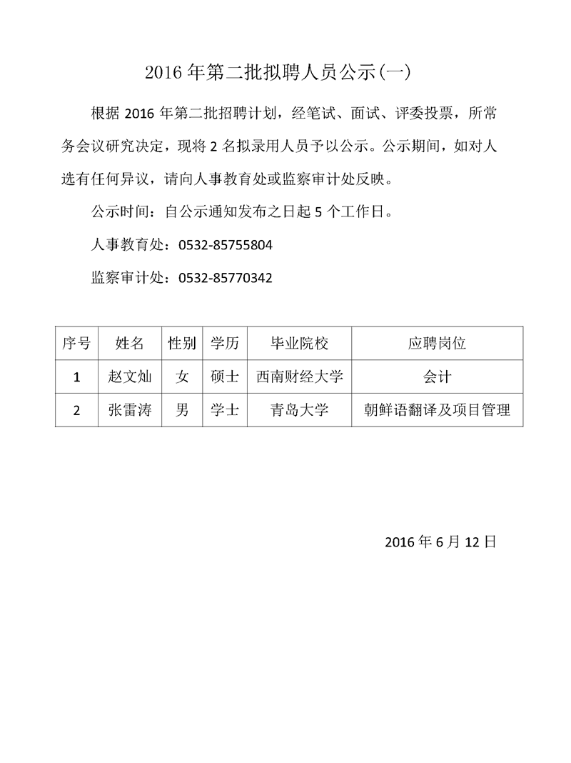 2016年第二批拟聘人员公示(一)