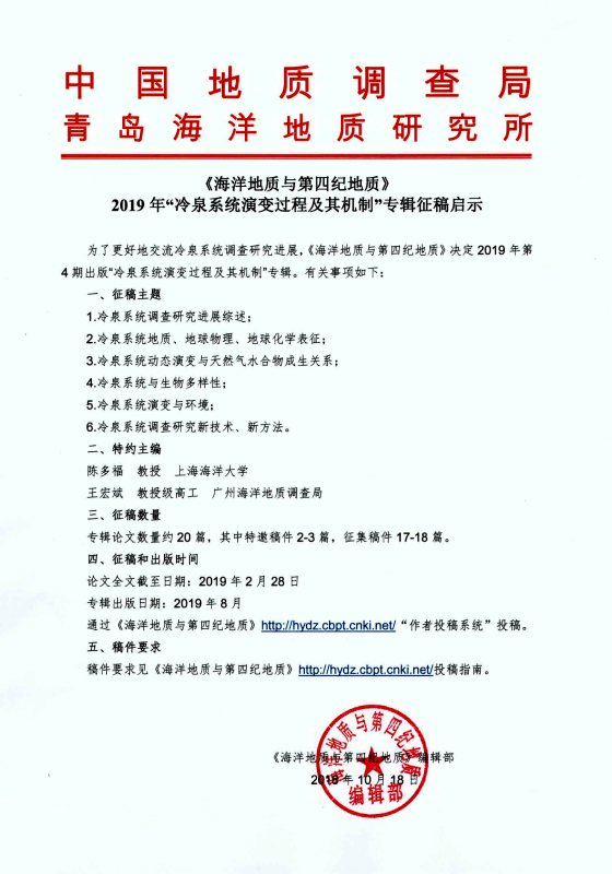 《海洋地质与第四纪地质》2019年冷泉系统专辑征稿启事