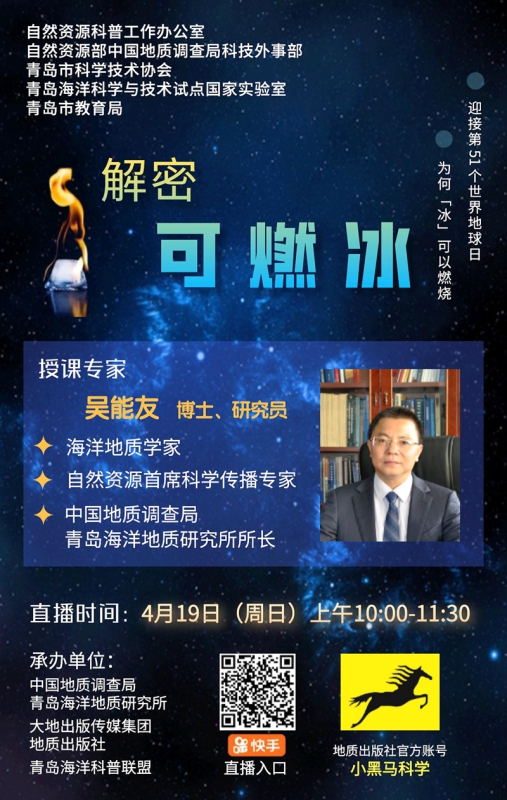 自然资源部中国地质调查局青岛海洋地质研究所在活动周期间,将举办“解密可燃冰”研学课程的网络直播。活动邀请自然资源首席科学传播专家、青岛海洋地质研究所吴能友研究员,作题为《可燃冰-未来新能源》的科普报告,现场展示可燃冰样品,做可燃冰点燃的科学实验,向公众普及海洋地质科学知识。