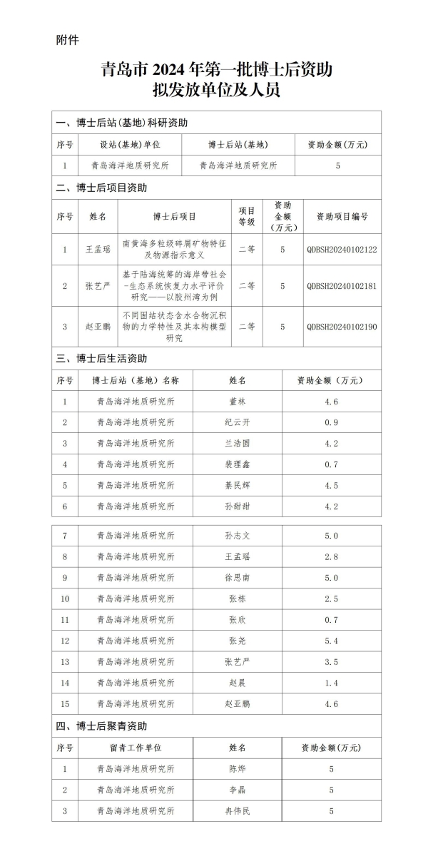 根据《关于印发<青岛市促进博士后聚青创新创业实施细则>的通知》(青人社发〔2022〕7号)《关于组织做好2024年第一批博士后资助审核发放工作的通知》等文件要求,现对青岛市 2024 年第一批博士后资助拟发放单位及人员(名单见附件)予以公示,公示时间:2024年4月22日-2024年4月26日。