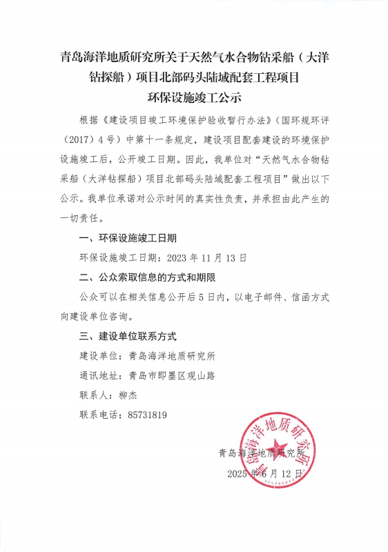 青岛海洋地质研究所关于天然气水合物钻采船(大洋钻探船)项目北部码头陆域配套工程项目环保设施竣工公示
