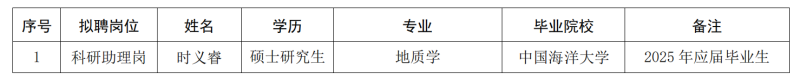 根据《中国地质调查局青岛海洋地质研究所科研助理岗招聘公告》,现将本次科研助理岗招聘拟录用人员予以公示。公示期间,如有问题,请向我单位反映。